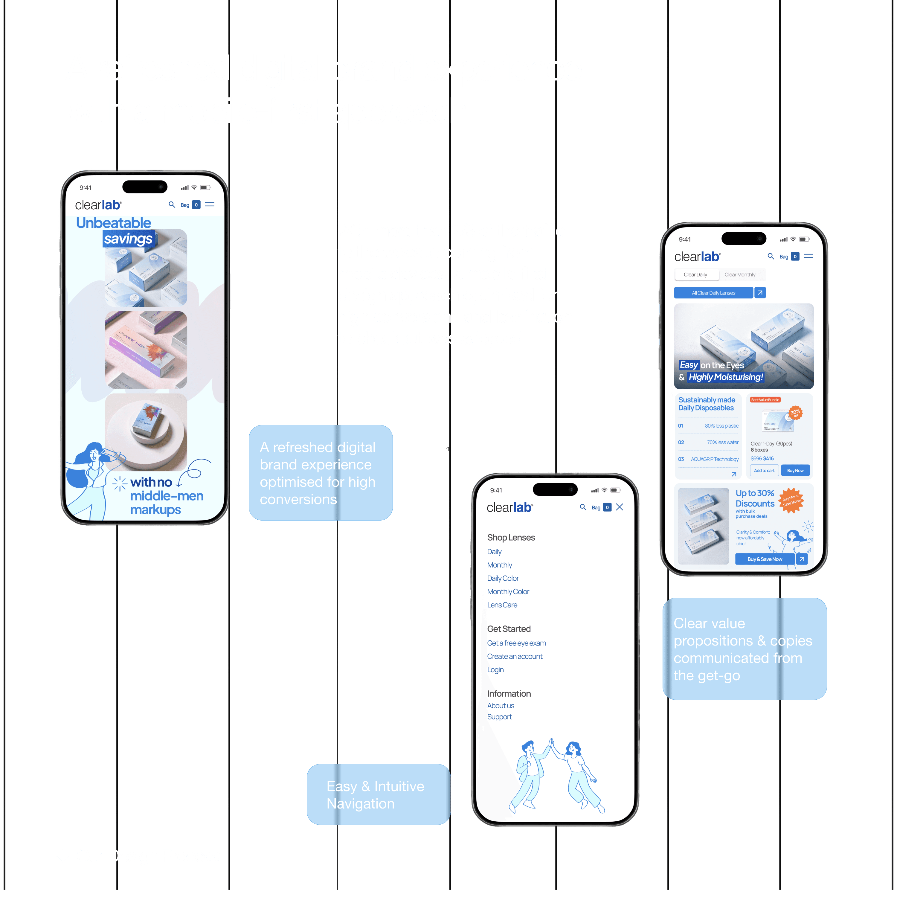 In 2023, I joined Clearlab - a leading contact lens manufacturer faced challenges transitioning into the Direct-to-Consumer market. Hindered by a poorly designed website, inconsistent branding, and the absence of a digital marketing strategy, I worked to revitalise their digital presence through user-centered design, data-driven research, and strategic marketing, resulting in a cohesive online experience that realigned the brand with its target audience. This transformation led to a 65% year-over-year revenue growth, demonstrating the impact of tailored strategies and creative execution in a competitive market.