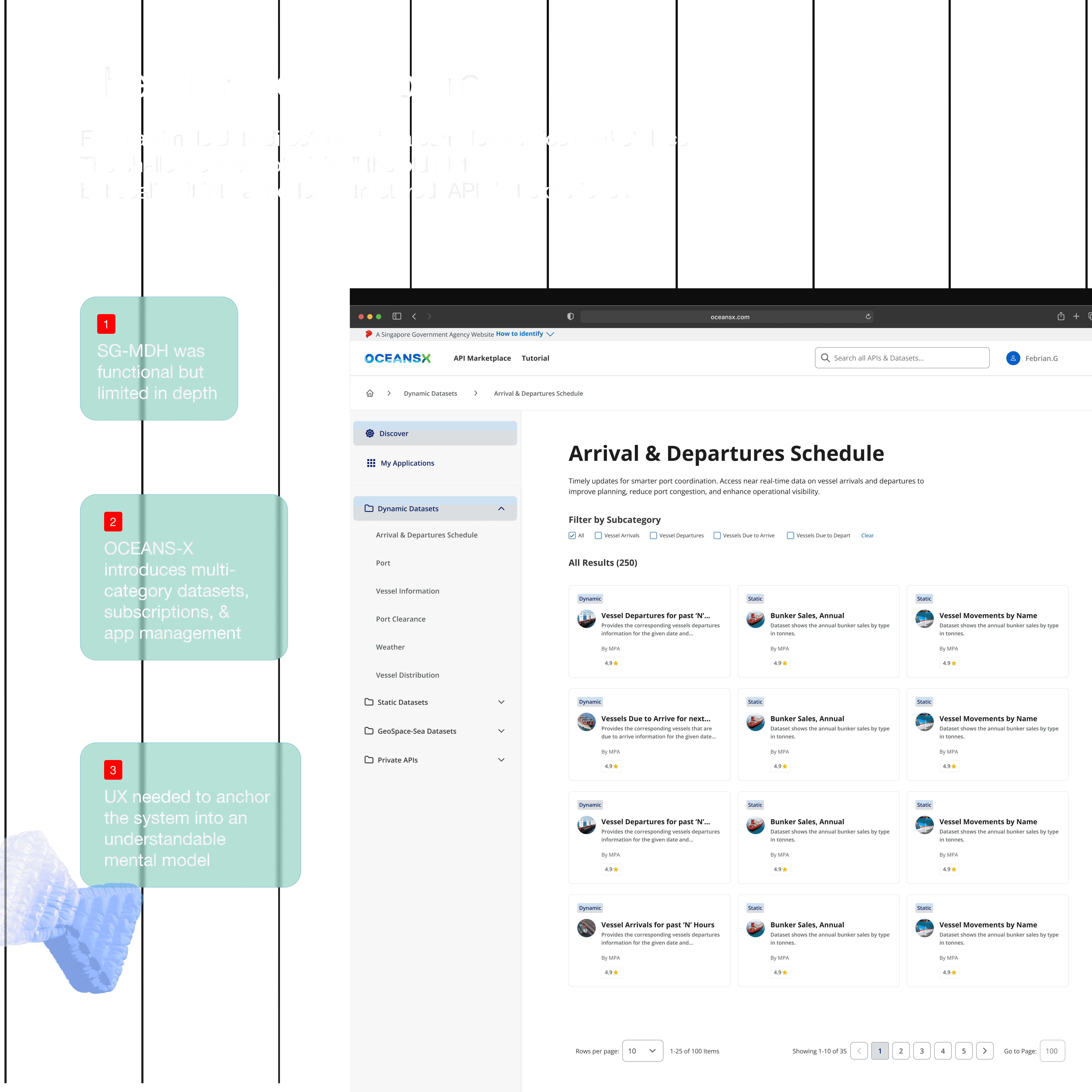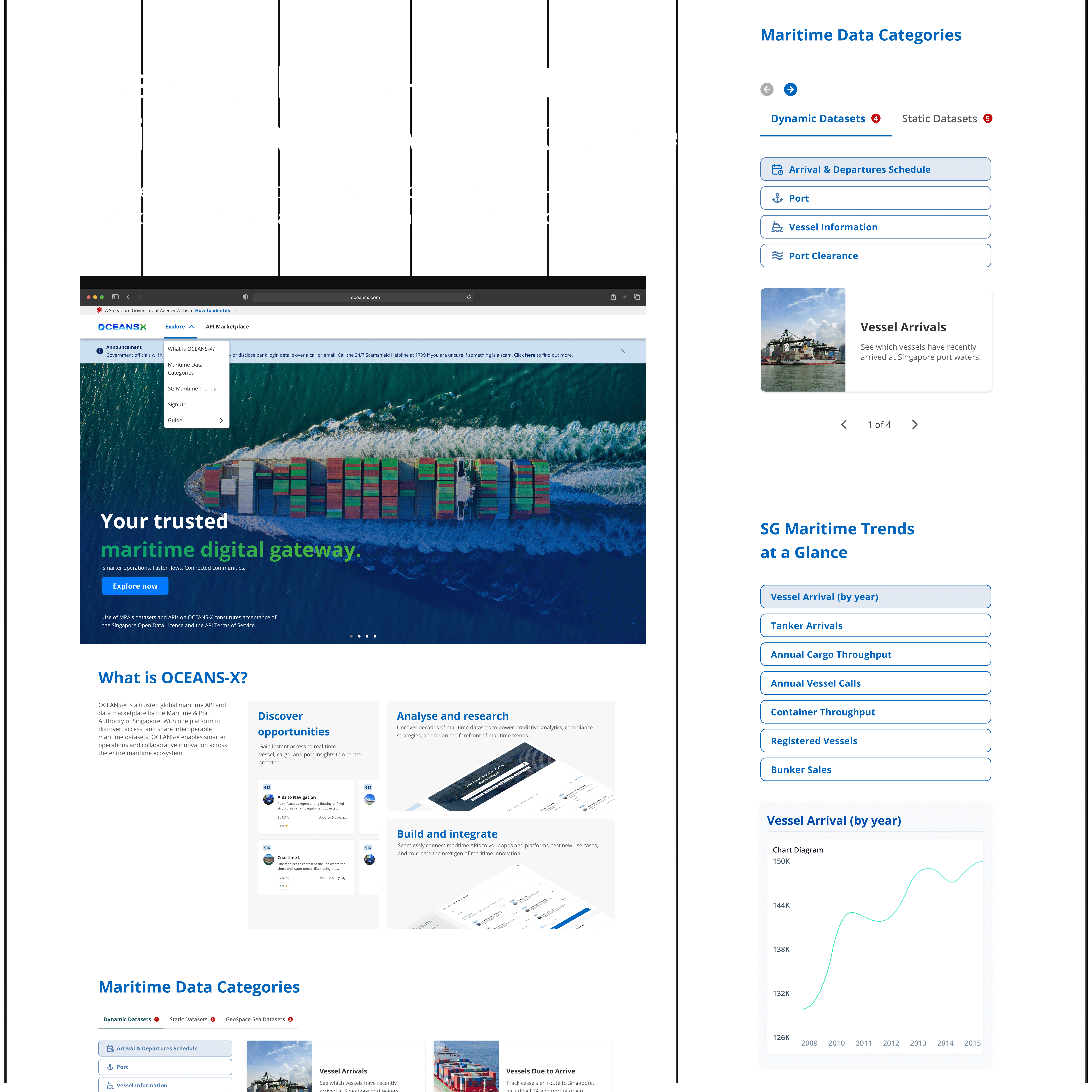 OCEANS-X is the Maritime & Port Authority of Singapore’s next-generation API marketplace, built to replace the existing SG-MDH platform and enable seamless G2G and G2B access to maritime datasets. I joined the project as the UX designer responsible for shaping the end-to-end experience across both the CMS information site and the underlying out-of-box API gateway solution.
