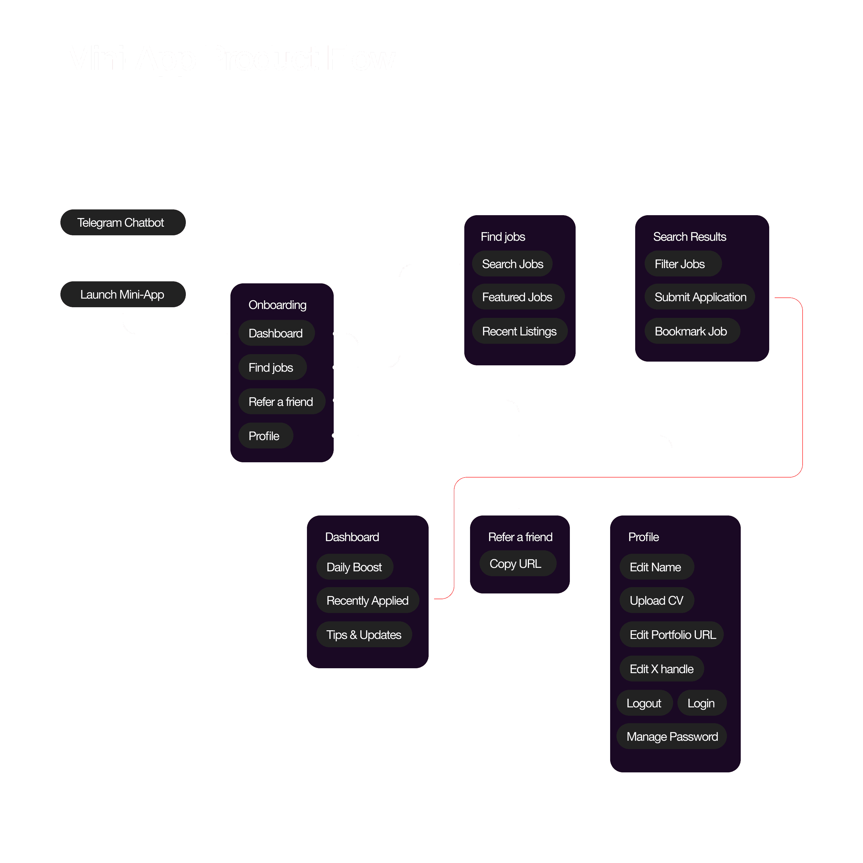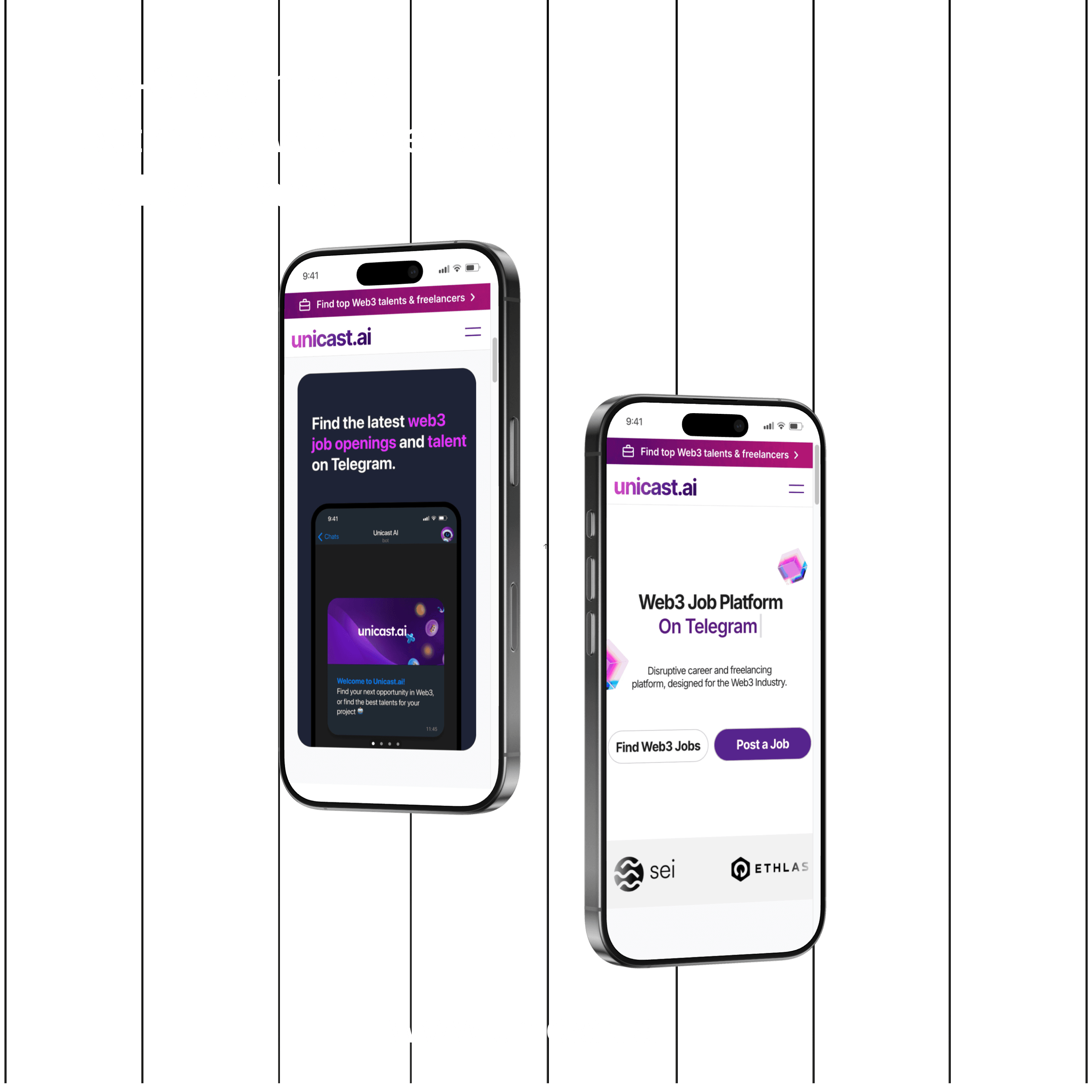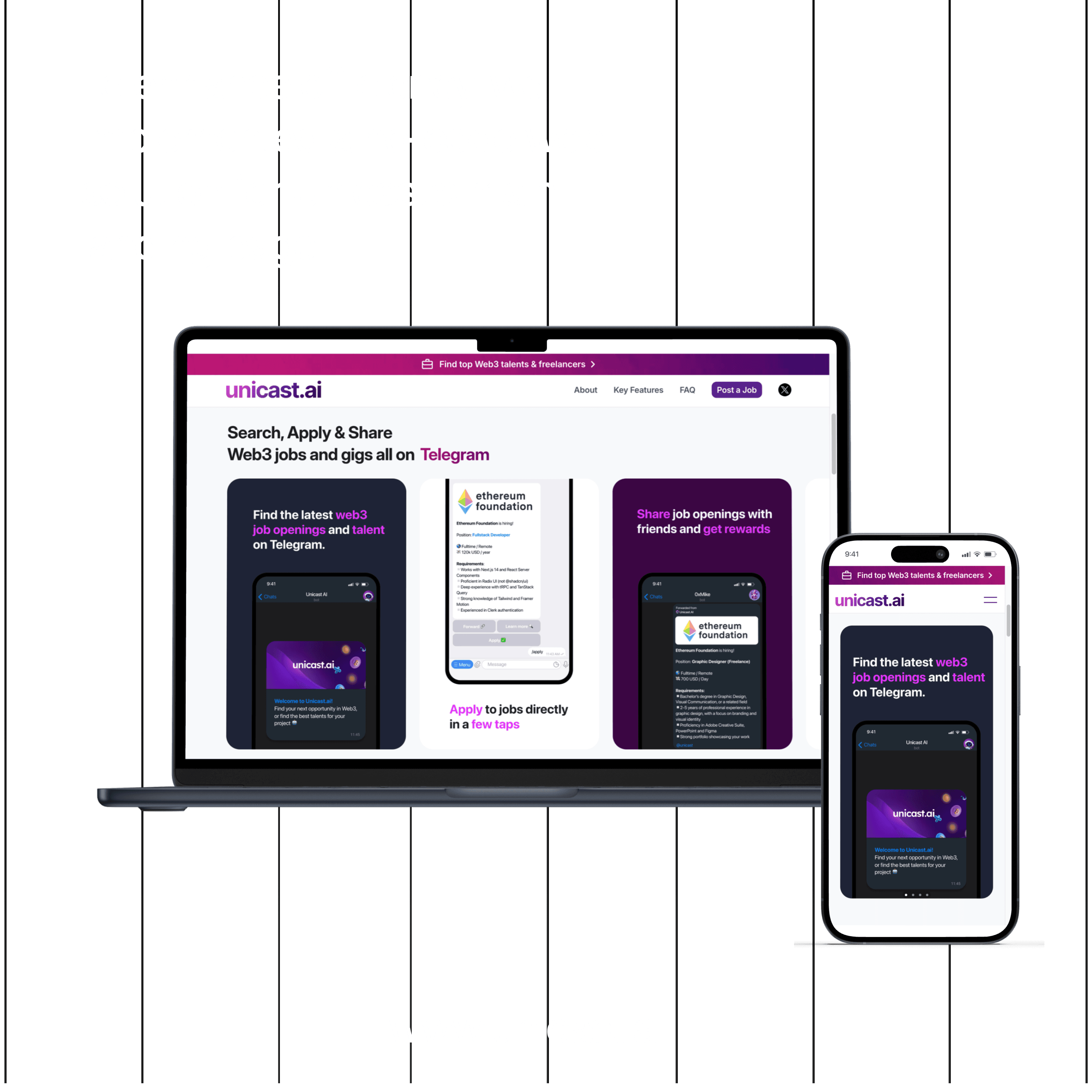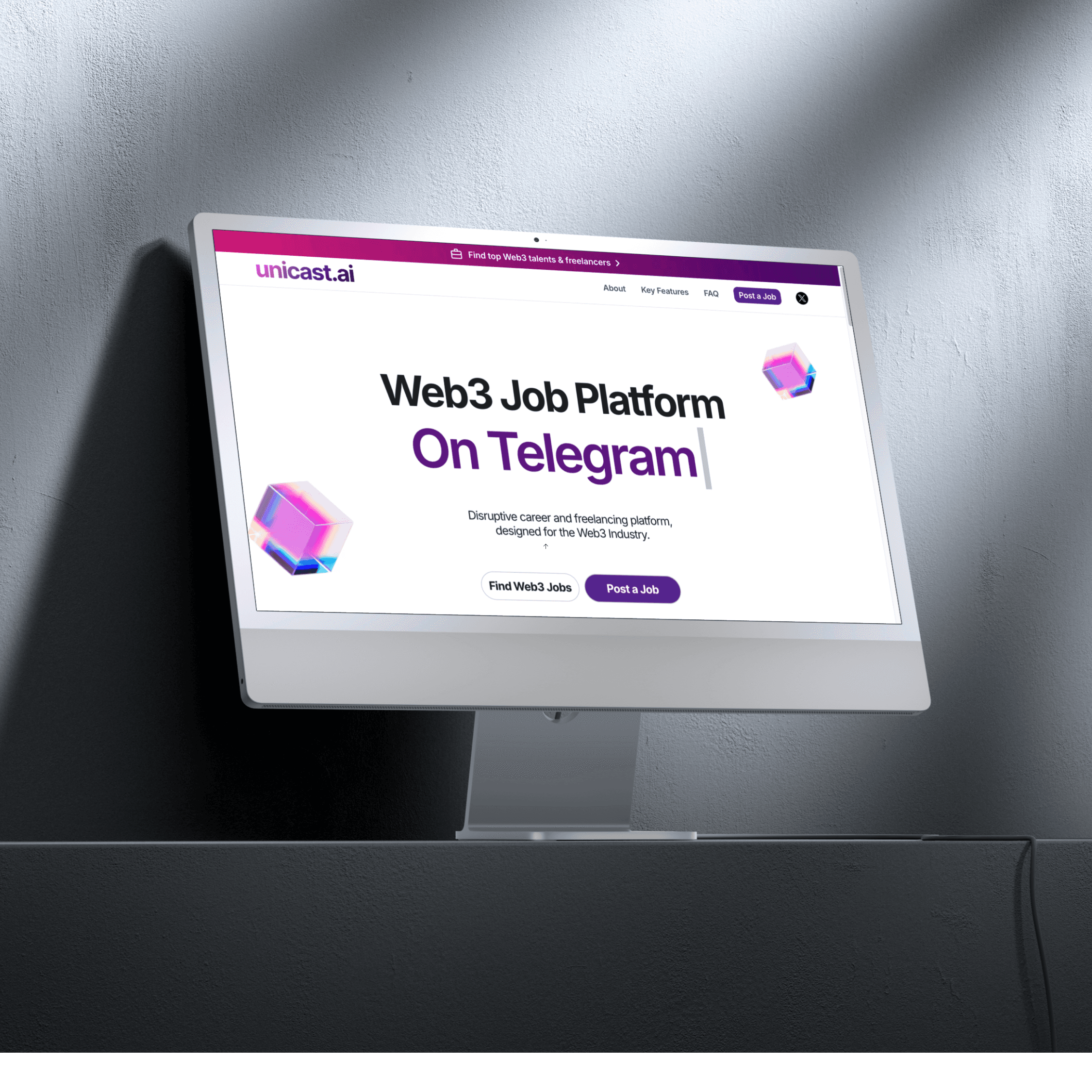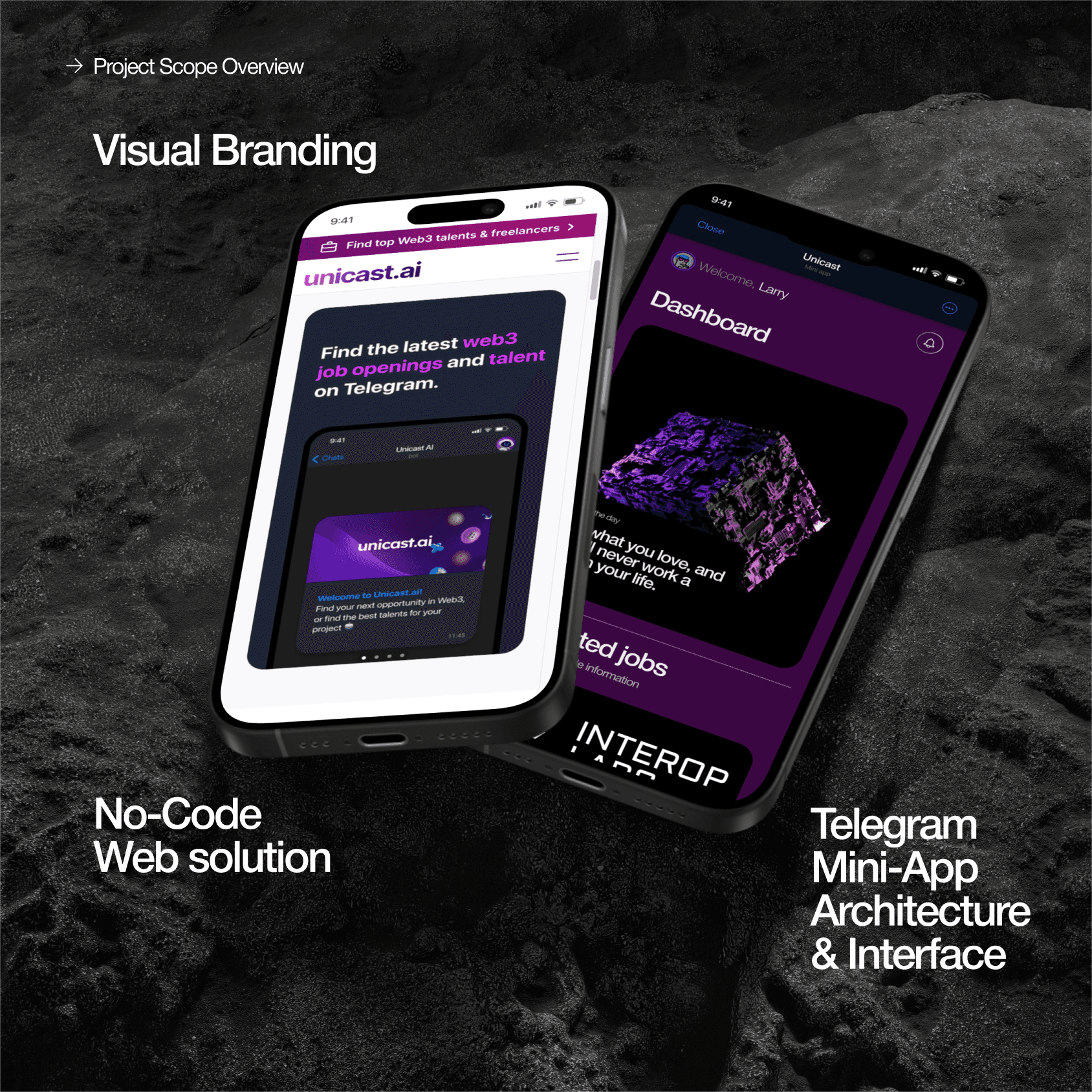 Unicast, the world's first Web3 job board & bot on Telegram, sought to create an AI-powered job discovery experience directly on Telegram as a mini-app. Unicast needed a compelling brand identity, an accessible website, and a seamless, intuitive interface for users within Telegram delivered within a short timeframe. I partnered with Unicast to bring these elements to life efficiently, using a mix of no-code web builders and rapid prototyping to expedite the project without compromising quality, delivering on-time for the project's launch.